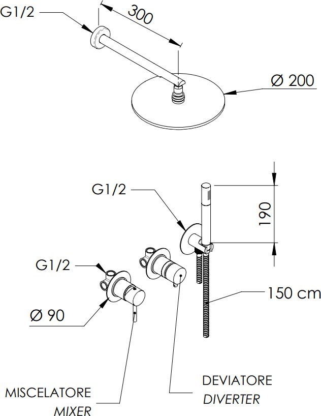- душевая лейка, верхний душ, держатель душевой лейки, душевой шланг, смеситель