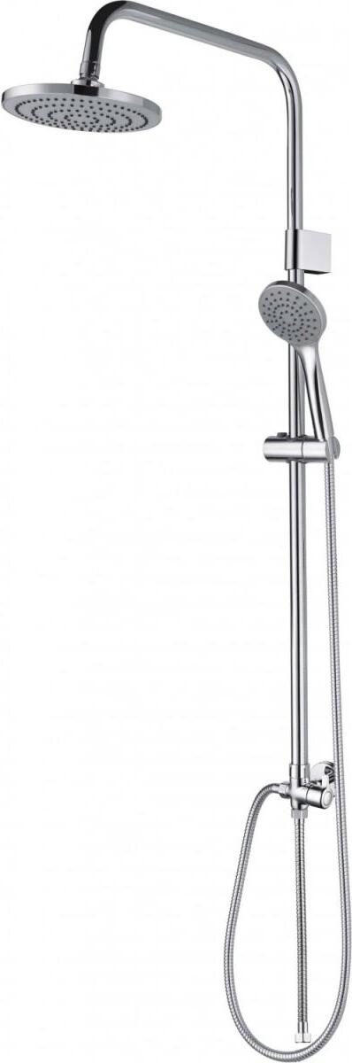 В душевой комплект вхдит 1- режимная душевая лейка, 1-режимный тропический душ, изготовленный из современной прочной пластмассы с никель-хромированным покрытием, душевая штанга с фиксированной высотой , держатель душевой лейки поворотный, душевой шланг с латунными гайками 150см, индивидуальный пакет, паспорт, гарантийный талон.