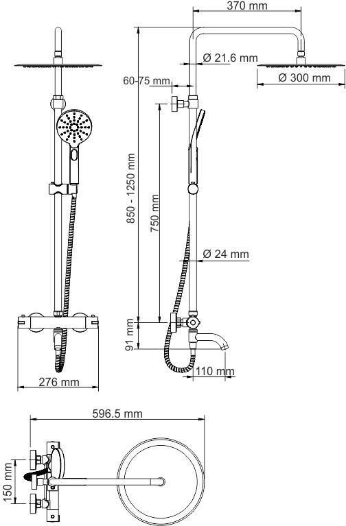 - душевая лейка, душевая штанга, верхний душ, термостат, держатель душевой лейки, душевой шланг