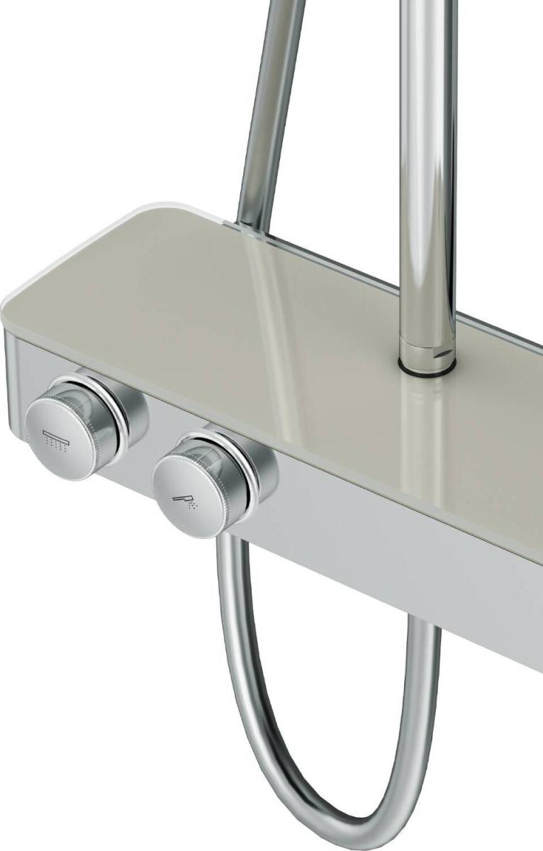 Верхняя часть смесителя выполнена из глянцевого стекла и является интегрированной полочкой для нужных мелочей при приёме душа;