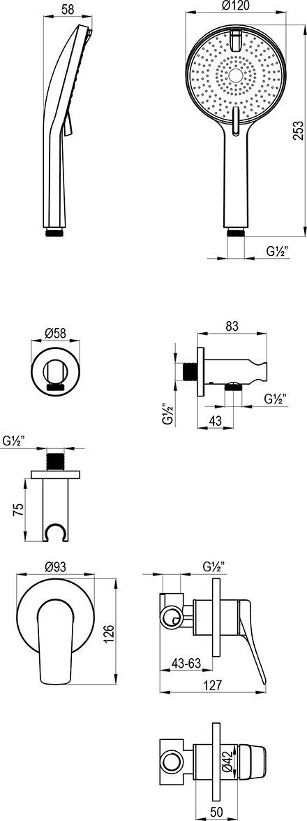 - душевая лейка, шланговое подключение, держатель душевой лейки, душевой шланг