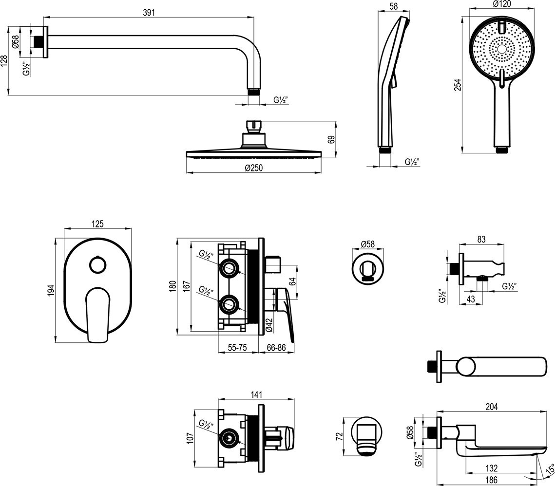 - душевая лейка, верхний душ, держатель душевой лейки, душевой шланг, смеситель