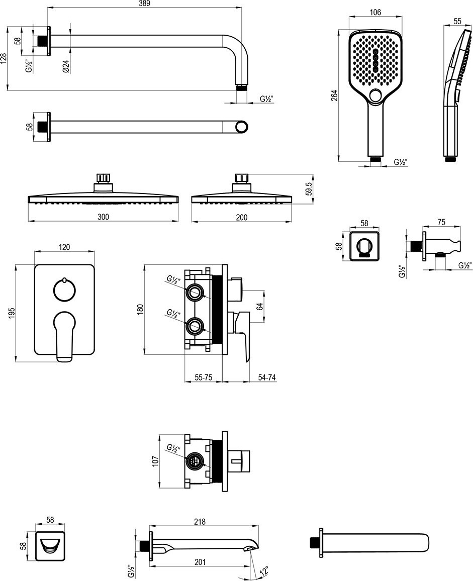 - душевая лейка, верхний душ, излив, держатель душевой лейки, душевой шланг, смеситель