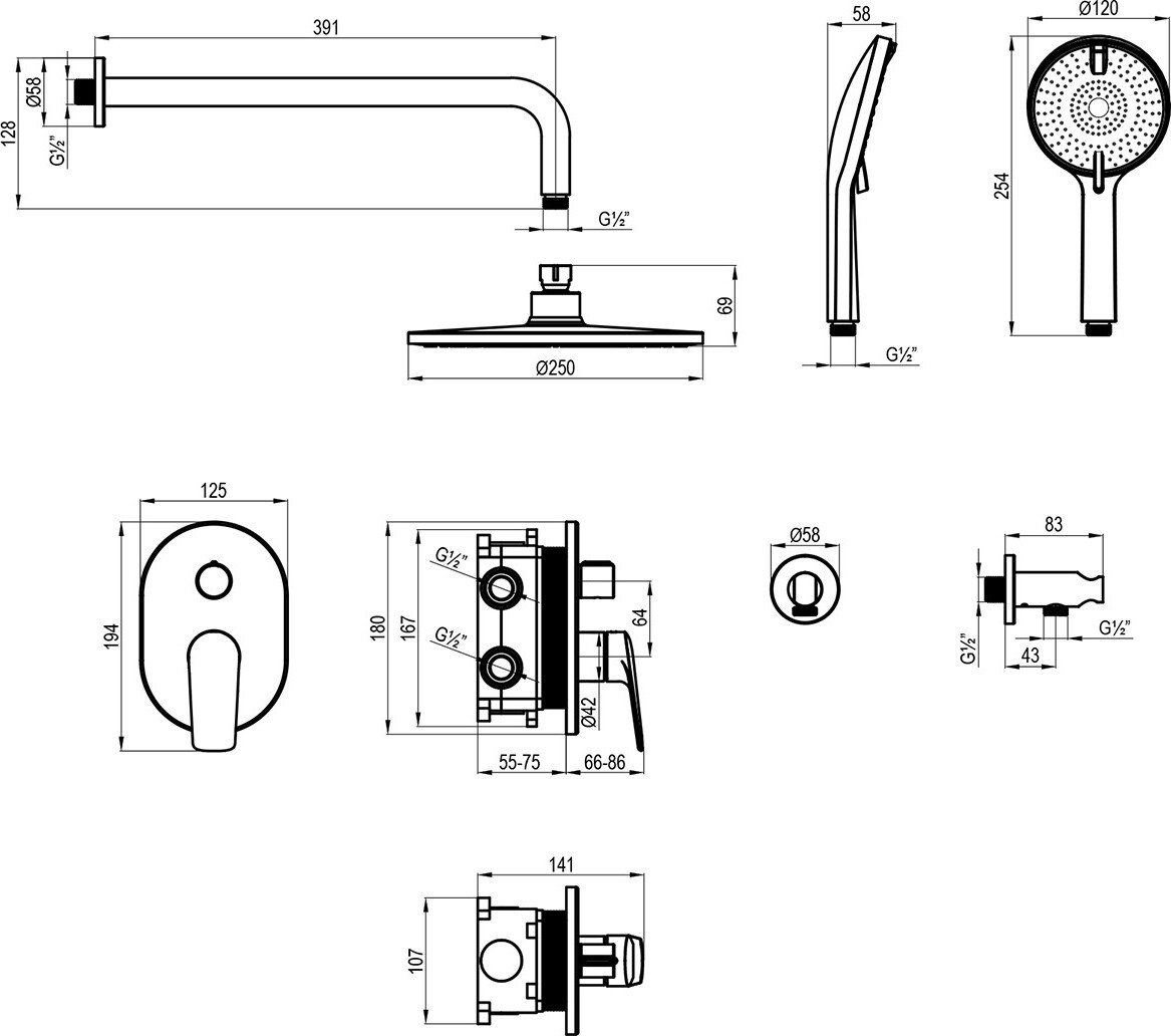 - душевая лейка, верхний душ, держатель душевой лейки, душевой шланг, смеситель