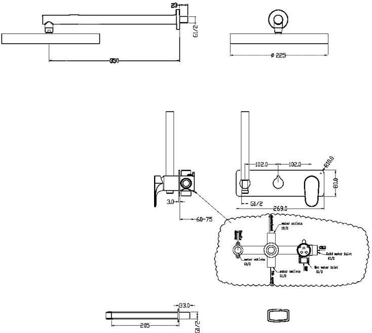 - душевая лейка, скрытая монтажная часть, верхний душ, излив, держатель душевой лейки, душевой шланг, смеситель