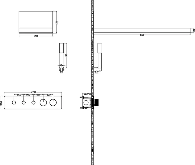 - душевая лейка, верхний душ, держатель душевой лейки, душевой шланг, смеситель