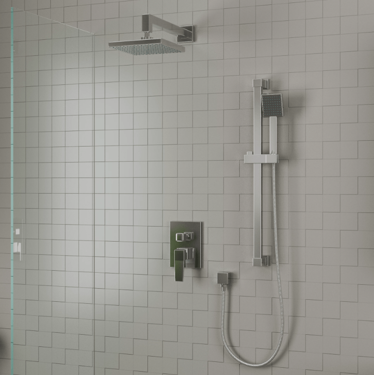 - душевая лейка, скрытая монтажная часть, душевая штанга, верхний душ, держатель душевой лейки, душевой шланг, смеситель