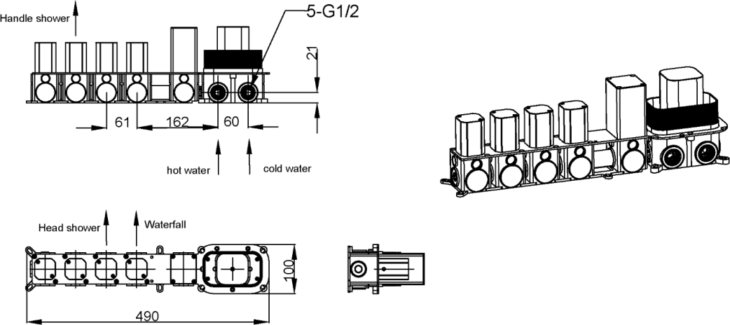 - душевая лейка, верхний душ, держатель душевой лейки, душевой шланг, смеситель