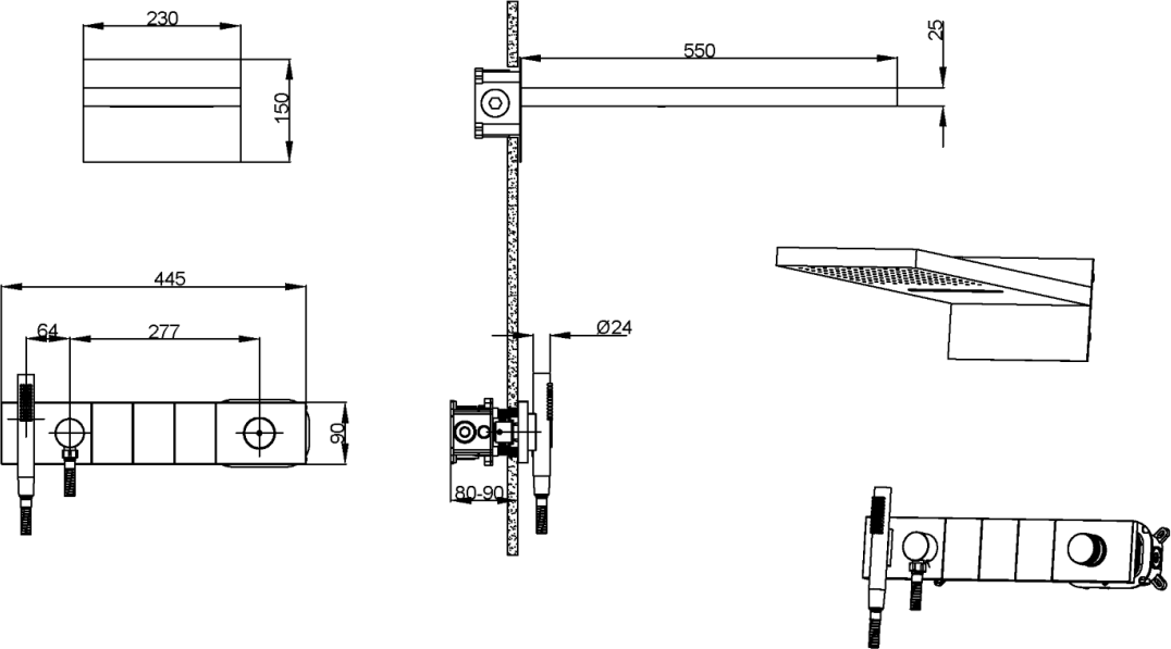 - душевая лейка, верхний душ, излив, держатель душевой лейки, душевой шланг, смеситель