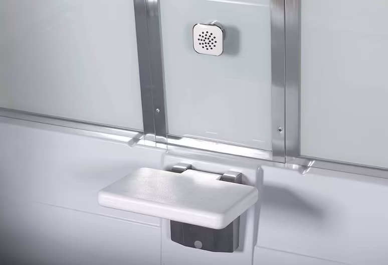 - сифон, полки, душевая лейка, радио, зеркало, шланг для душа, держатель душа, рама-подставка, чаша, подсветка, верхний душ