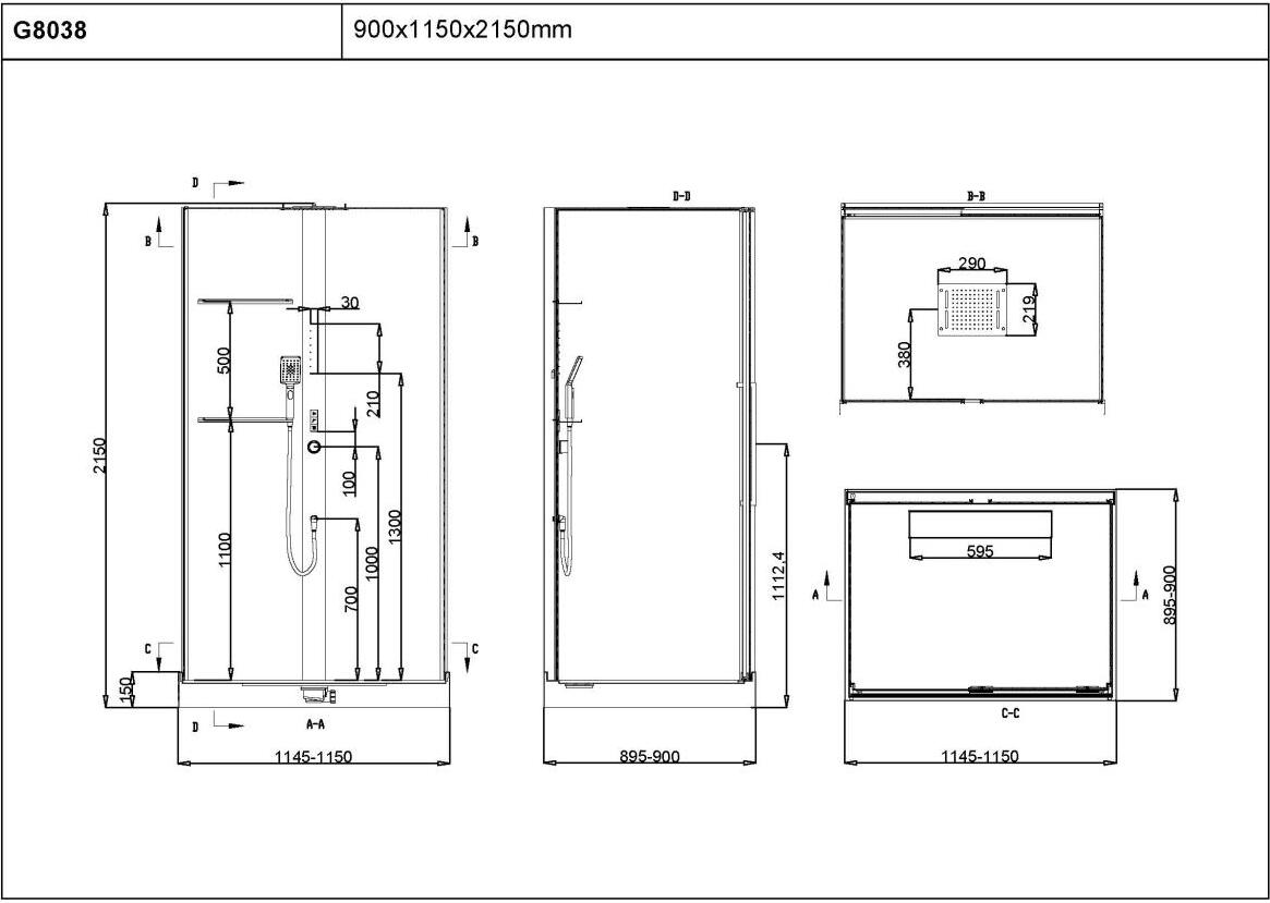 Душевая кабина B&W G8038 115х90х215 стекло прозрачное профиль черный матовый