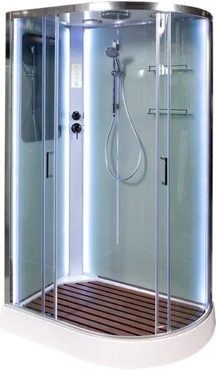 - полки, смеситель, душевая лейка, зеркало, шланг для душа, держатель душа, подсветка, верхний душ