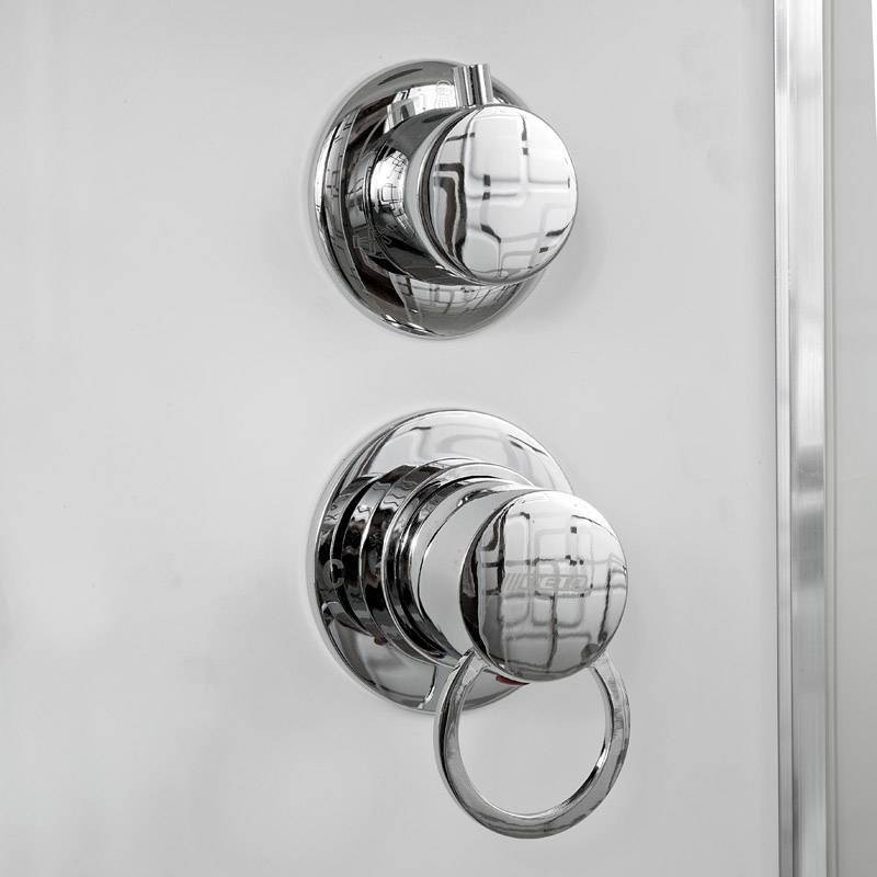 - полки, смеситель, душевая лейка, радио, зеркало, поддон, шланг для душа, держатель душа, верхний душ