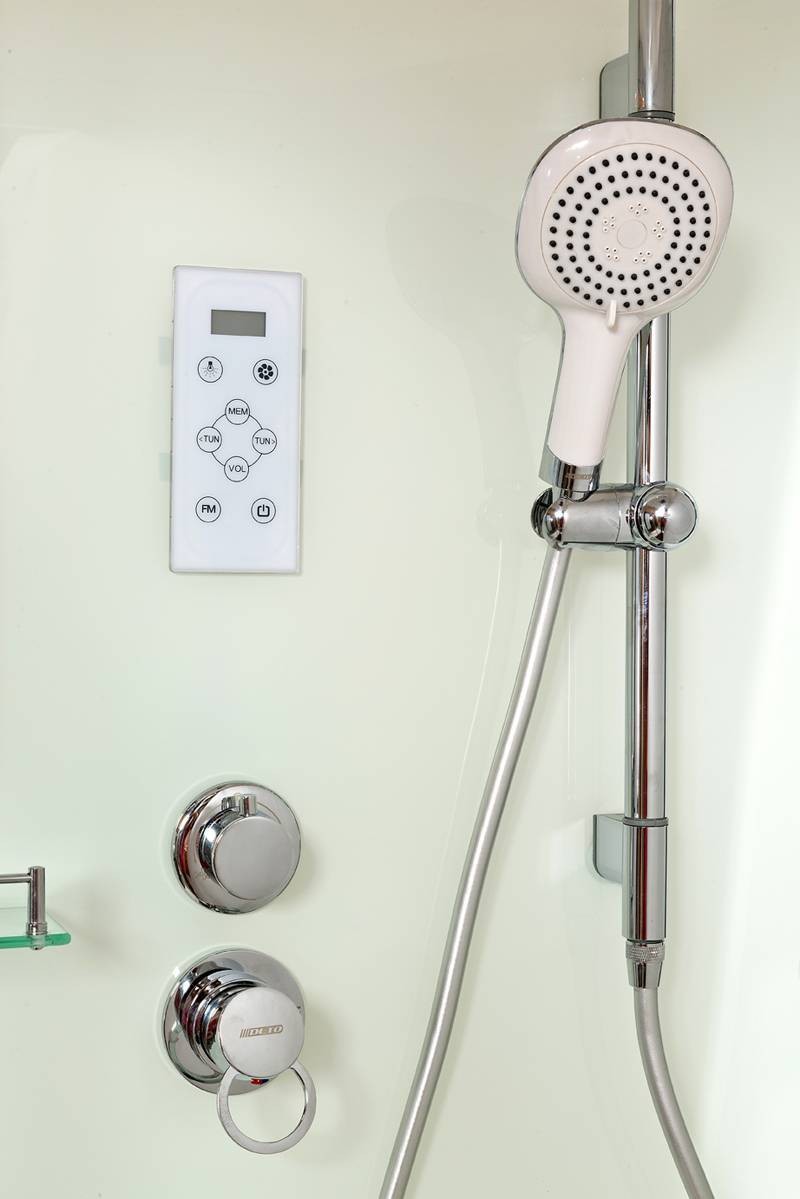 - сифон, душевой гарнитур, смеситель, душевая лейка, радио, подсветка, верхний душ