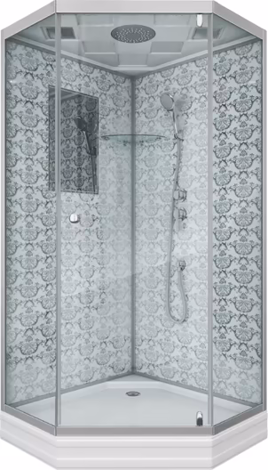 Душевая кабина Niagara NG-7702DW с серебристым рисунком на задних стенках станет украшением любой ванной комнаты. Модель имеет пятиугольную форму со стороной 100 см. Такая предполагает установку в углу помещения. Благодаря такому размещению и прозрачному переднему ограждению сантехника визуально не будет загромождать пространство.