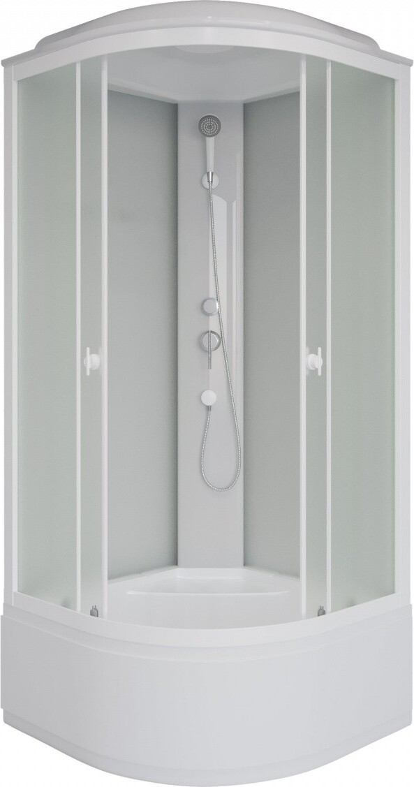 Стекла душевой кабины Promo имеют матовую поверхность. Двери раздвижные с одинарными роликами.
