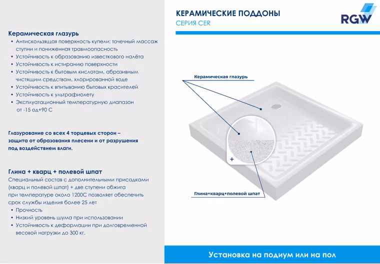 Душевые поддоны из керамики, классика дизайна. Обладают высокой прочностью к нагрузкам и не боится абразивных чистящих средств. Рельефная поверхность поддона - это приятный массаж ваших ног и дополнительная безопасность.