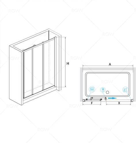 Душевая дверь раздвижная, одна фиксированная панель и две сдвижных. Стекло обрамлено цельной алюминиевой рамой. Трап или поддон приобретается отдельно.