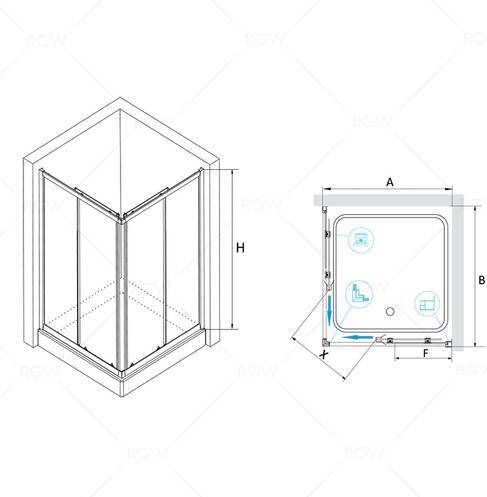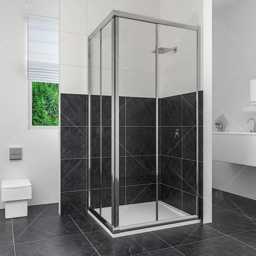 Душевой уголок квадратный, две раздвижные двери. Стекло обрамлено цельной алюминиевой рамой. Трап или поддон приобретается отдельно.