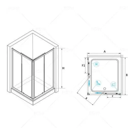 Душевой уголок прямоугольный. Стекло обрамлено цельной алюминиевой рамой. Две раздвижные двери. Трап или поддон приобретается отдельно.