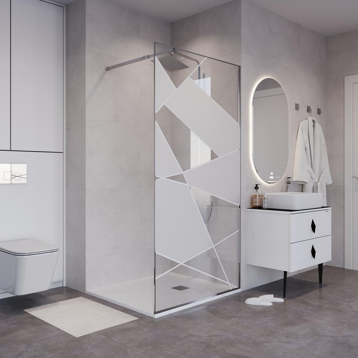 Телескопическая штанга с регулировкой от 700 до 1200 мм позволяет легко адаптировать душевую перегородку к различным размерам душевого пространства, обеспечивая идеальную посадку и плотное прилегание к стенам. Хромированный профиль и рисунок на стекле придает ограждению современный и стильный вид, который гармонично впишется в любой дизайн ванной комнаты. Стекло имеет белые полосы и чередующиеся прозрачные и матовые геометрические элементы.