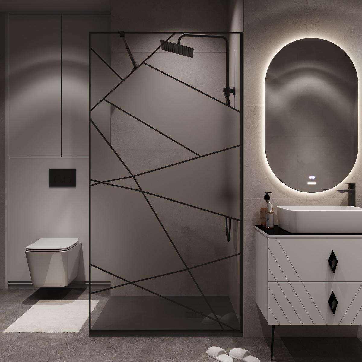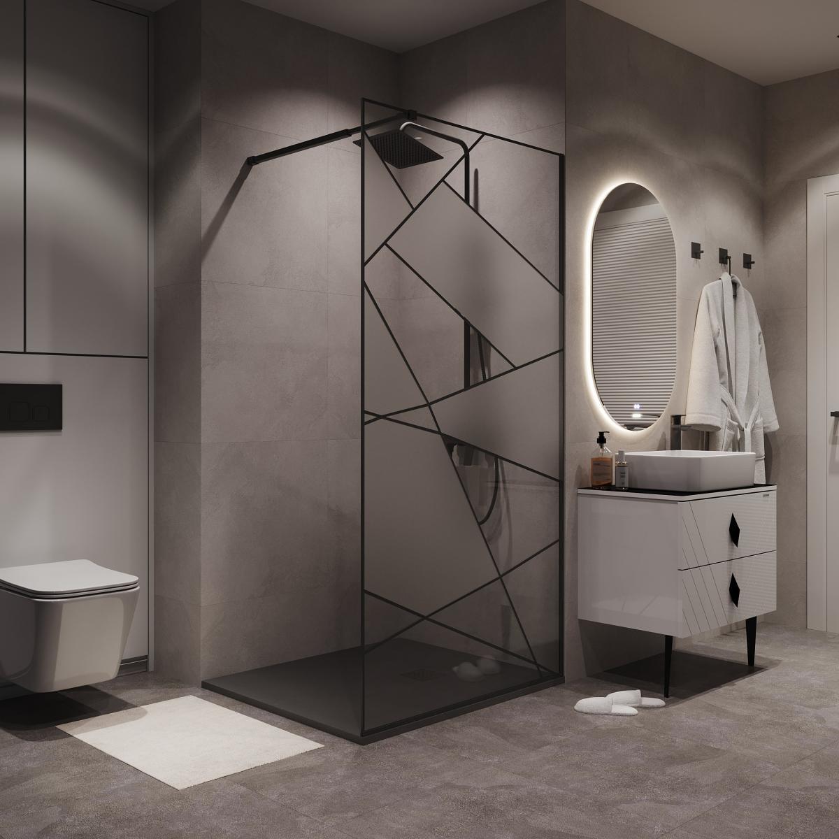 Телескопическая штанга с регулировкой от 700 до 1200 мм позволяет легко адаптировать душевую перегородку к различным размерам душевого пространства, обеспечивая идеальную посадку и плотное прилегание к стенам. Черный матовый профиль и рисунок на стекле придает ограждению современный и стильный вид, который гармонично впишется в любой дизайн ванной комнаты. Стекло имеет черные полосы и чередующиеся прозрачные и матовые геометрические элементы.
