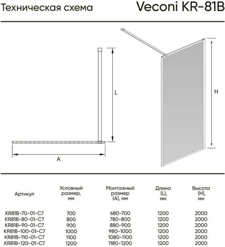 Душевая перегородка Veconi KR81B-90-01-C8 профиль черный, стекло прозрачное