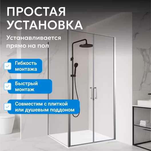 Две распашные двери на маятниковых петлях открываются внутрь и наружу — это удобно для небольших помещений. Металлические ручки увеличивают долговечность и комфорт. Покупатель может подобрать подходящий поддон: производитель оставляет возможность индивидуального выбора, что позволяет адаптировать уголок к разным требованиям.