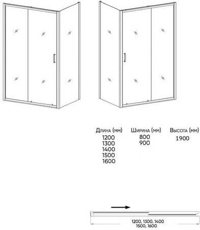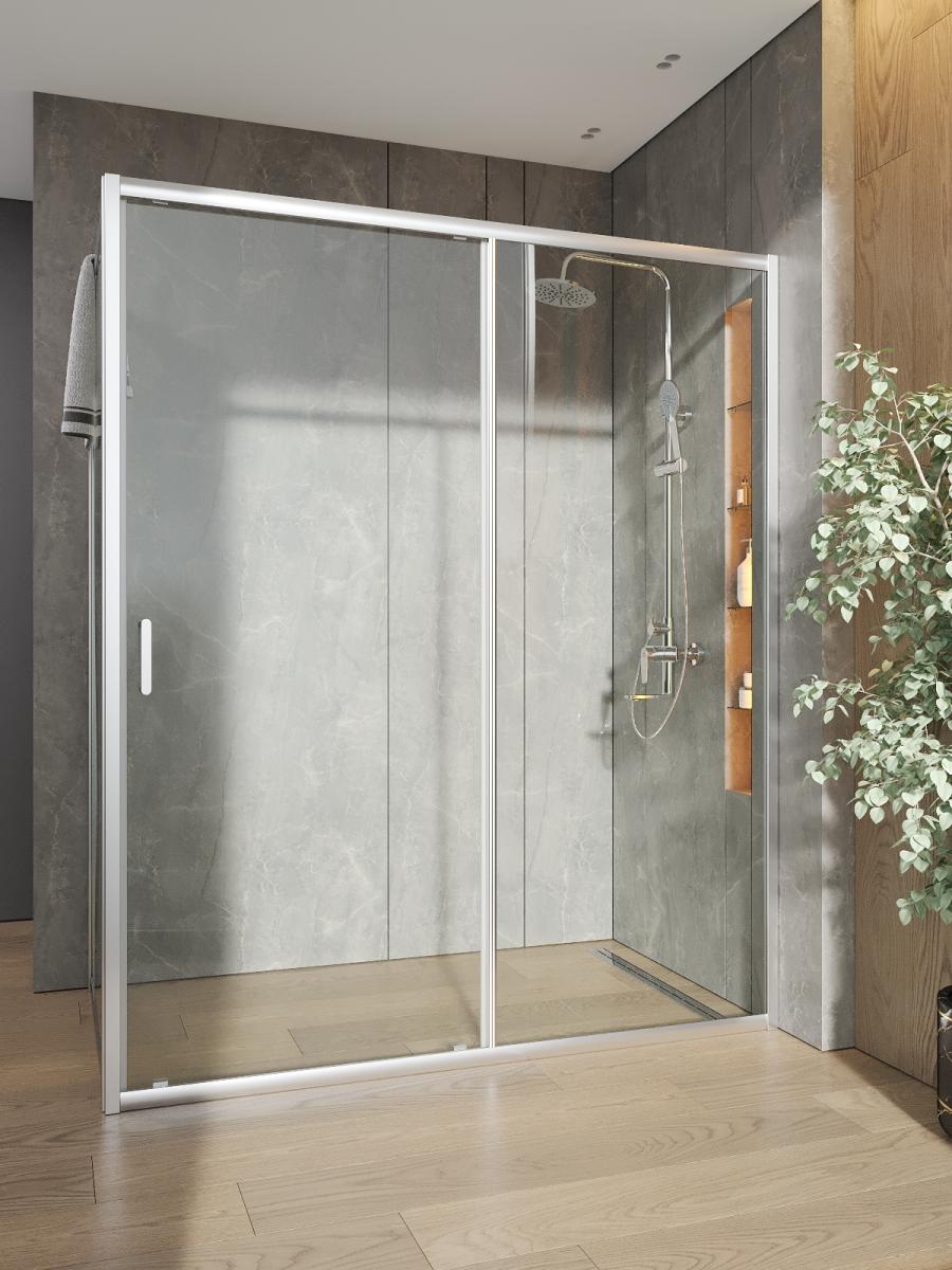 Душевой уголок без поддона с раздвижной дверкой. Закалённые прозрачные стекла толщиной 6 мм, у боковой перегородки 5 мм. Двойной регулируемый по ширине алюминиевый хромированный профиль. Двойные ролики.