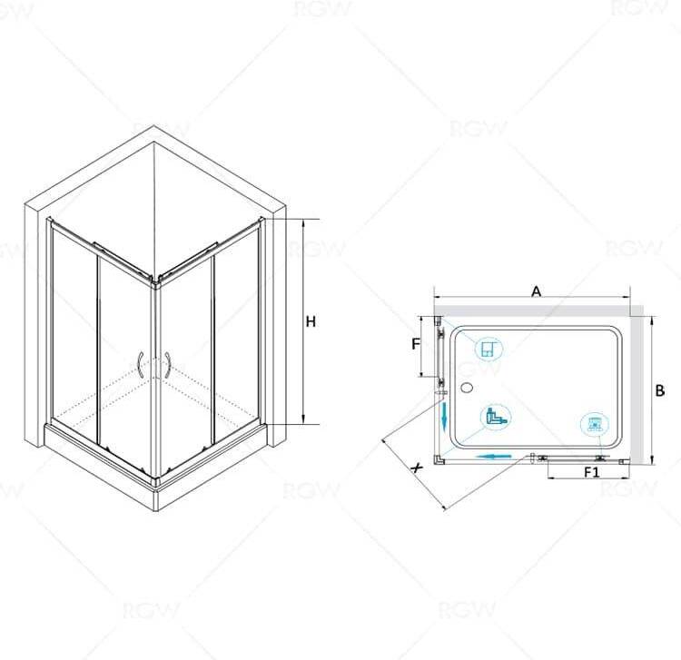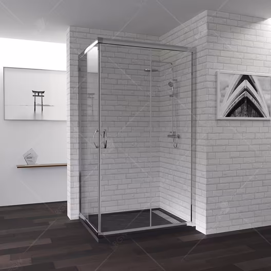 Душевой уголок прямоугольный, две раздвижные двери с угла.