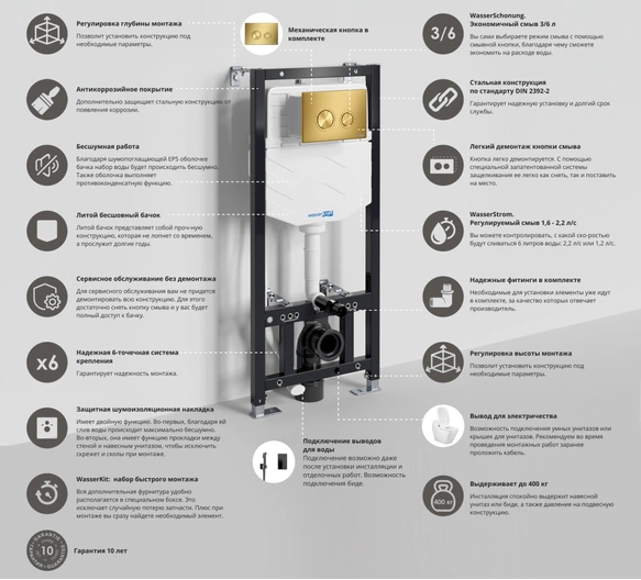Инсталляция для унитазов WasserKRAFT Aller 10TLT.010.ME.MG01 с золотой матовой кнопкой смыва