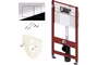 - Система инсталляции Смывной бачок Крепление для унитаза Комплект защитных заглушек Комплект патрубков с резиновыми манжетами Фановый отвод Шаблон для отделки отверстия под панель смыва Комплект креплений Звукоизолирующая прокладка Кнопка смыва Инструкция