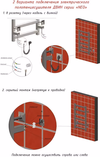 - Полотенцесушитель с диммером и таймером, телескопический крепеж к стене - 2 шт., маскировочный элемент для скрытой проводки - 2 шт., колодка клемная, кабель с вилкой - 1 шт.