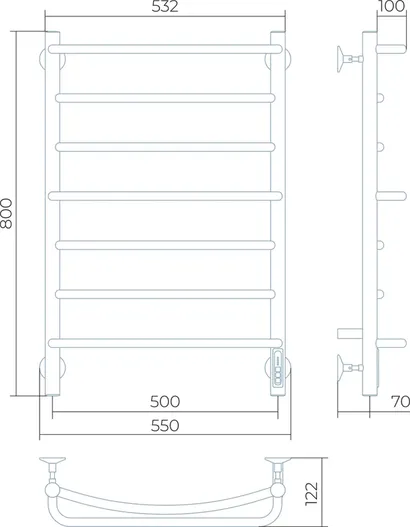 - Полотенцесушитель электрический, Заглушки на концах стоек, тип диммера - кнопочный (Quick Touch), крепления к стене.