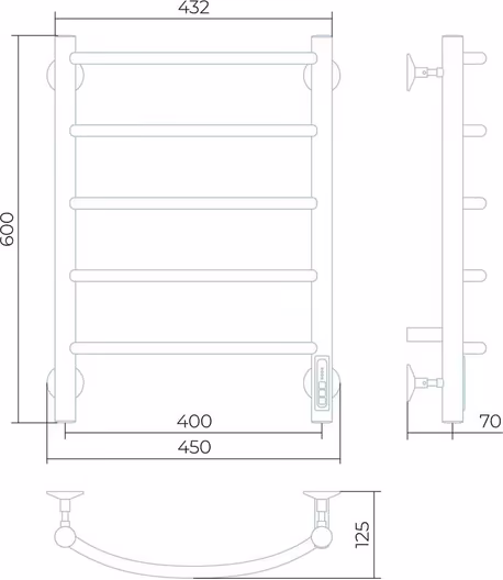 - Полотенцесушитель электрический, Заглушки на концах стоек, тип диммера - кнопочный (Quick Touch), крепления к стене.