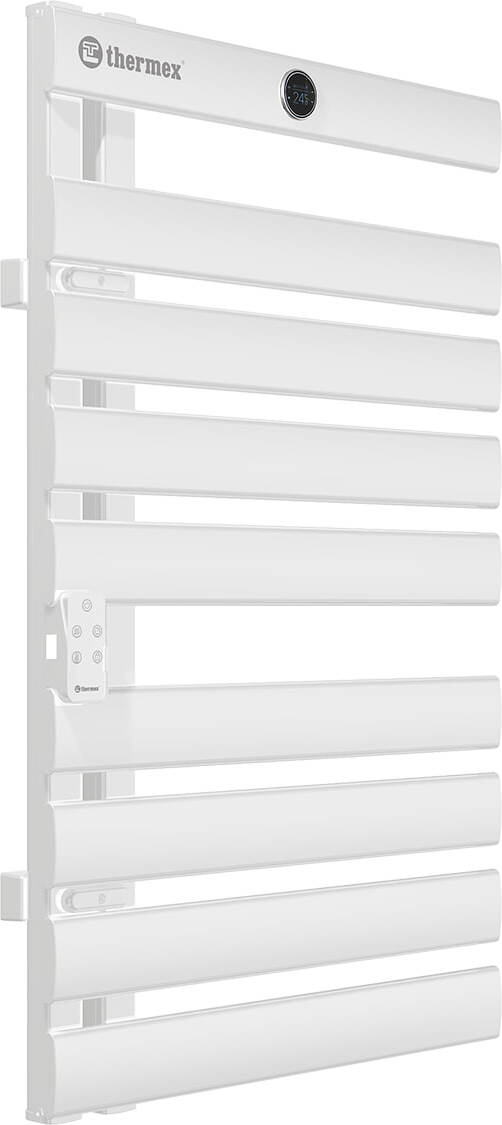- Простота установки и компактность. Thermex Njord можно установить в любом месте помещения, не прибегая к сложным сантехническим работам. Размеры электрического полотенцесушителя позволяют не занимать много пространства: высота составляет 910 мм, ширина 566 мм, а глубина – всего лишь 55 мм.