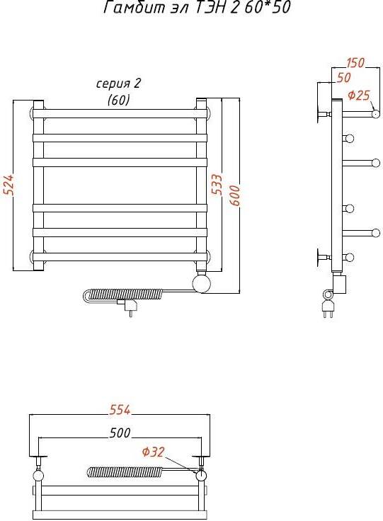 Полотенцесушитель электрический Тругор Гамбит ТЭН 2 60*50