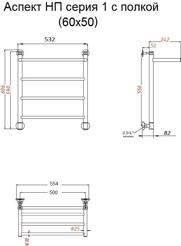 Полотенцесушитель водяной Тругор Аспект НП 1 П 60х50 с полкой, универсальное подключение