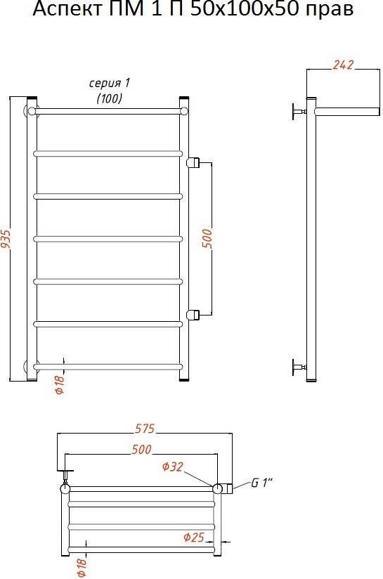 Полотенцесушитель водяной Тругор Аспект 1 50х100х50 боковое подключение правое с полкой