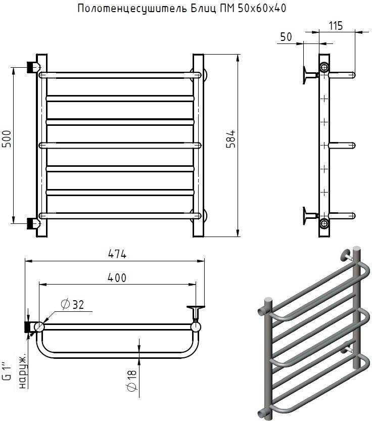 - полотенцесушитель, паспорт изделия, телескопический держатель - 2 шт., гарантийный талон
