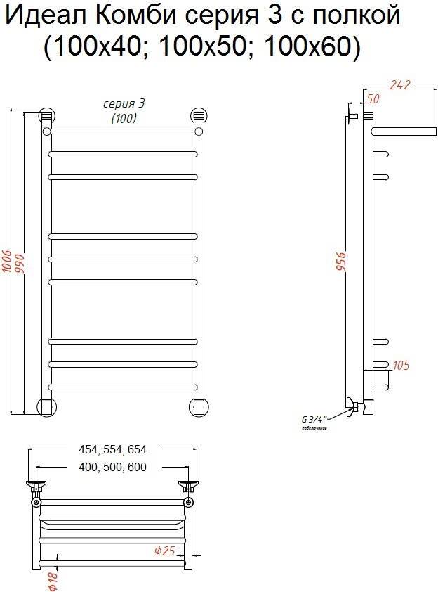 Полотенцесушитель водяной Тругор Идеал комби 100*50 универсальное подключение с полкой