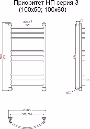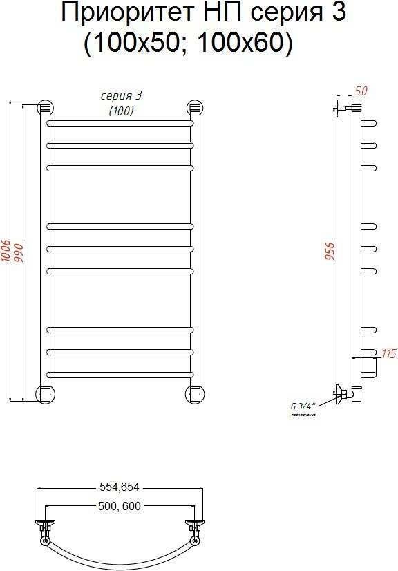 Полотенцесушитель водяной Тругор Приоритет 3 100*60 универсальное подключение УТ-00089036
