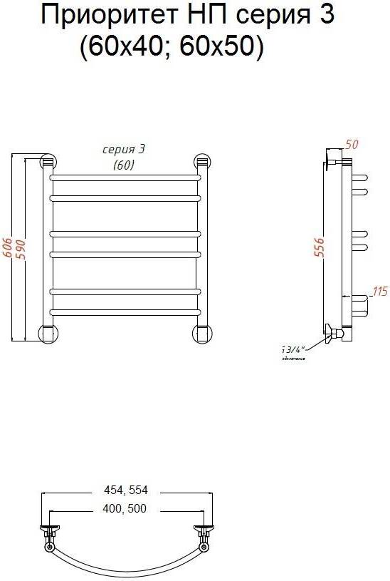 Полотенцесушитель водяной Тругор Приоритет 3 60*40 универсальное подключение УТ-00089040