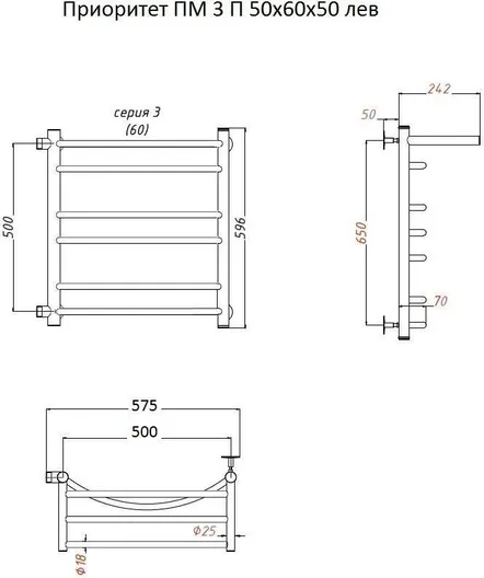 Полотенцесушитель водяной Тругор Приоритет 3 60*50 боковое подключение левое с полкой