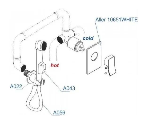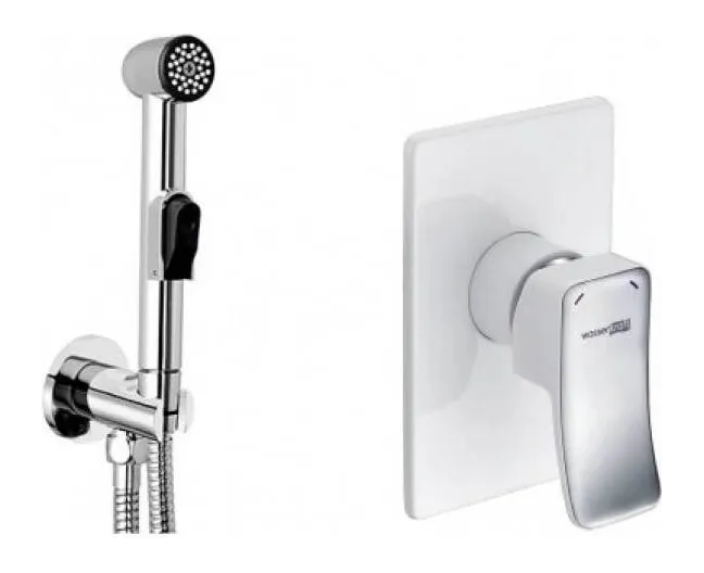 - скрытая монтажная часть, шланговое подключение, гигиенический душ, держатель душевой лейки, смеситель