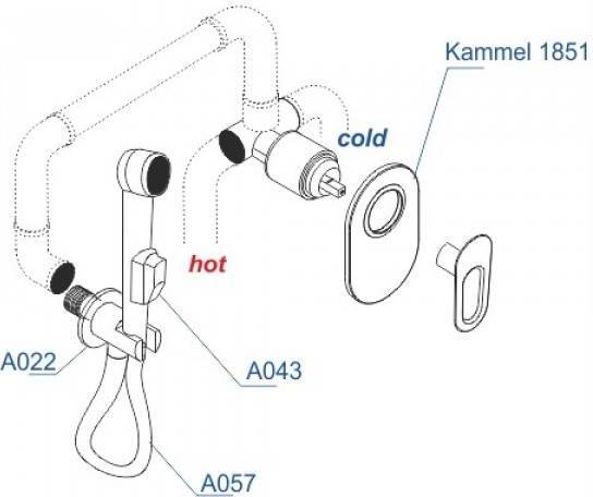 - скрытая монтажная часть, шланговое подключение, гигиенический душ, держатель душевой лейки, смеситель