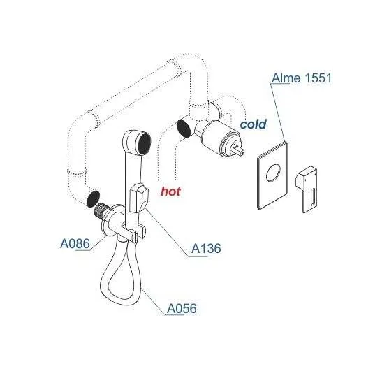 - скрытая монтажная часть, гигиенический душ, держатель душевой лейки, душевой шланг, смеситель