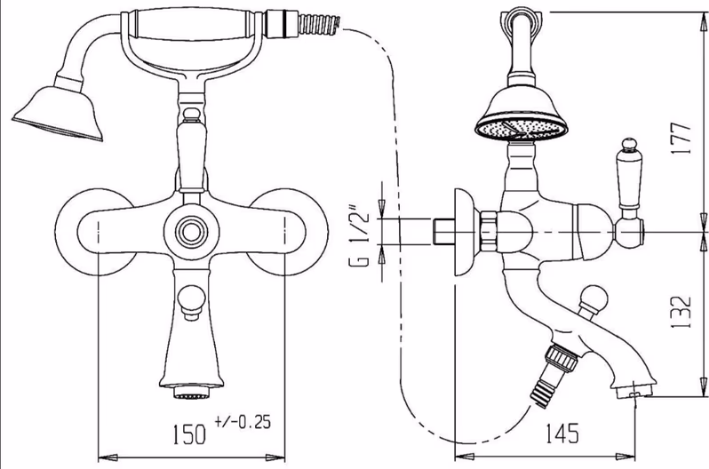Настенный смеситель для ванны Cezares Atlantis Nostalgia ATLANTIS-NOSTALGIA-VD-03/24 двухвентильный, монтируемый в два отверстия, с аэратором, с душевым гарнитуром. Мягкие классические линии коллекции Atlantis Nostalgia воплощают идеал стиля ретро, навевая дух старины, шарма и ностальгии. Этот образец безупречного мастерства несомненно создаст изысканный акцент в интерьере. Поверхность и ручки: золото 24 карата. Корпус: высококачественная латунь. Излив: фиксированный, L 14,5 см. Механизм: керамические кран-буксы. Переключатель душ/излив: удобная длинная ручка. Душевая лейка: однорежимная. Держатель лейки: фиксированный, на корпусе смесителя. Душевой шланг: гибкий. Стандарт подключения: G 1/2. Рабочий интервал давления: 0,5-6 Атм.