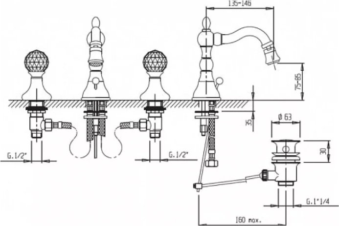 Смеситель CEZARES ATLANTIS для биде на три отверстия с донным клапаном, бронза, ручки Swarovski