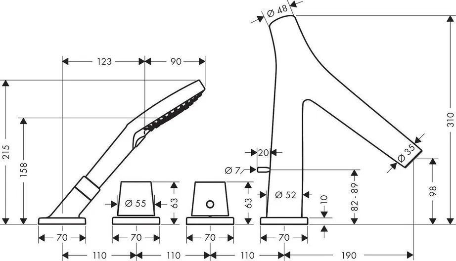 - душевая лейка, термостат, держатель душевой лейки, душевой шланг